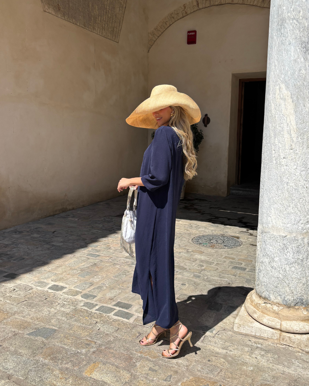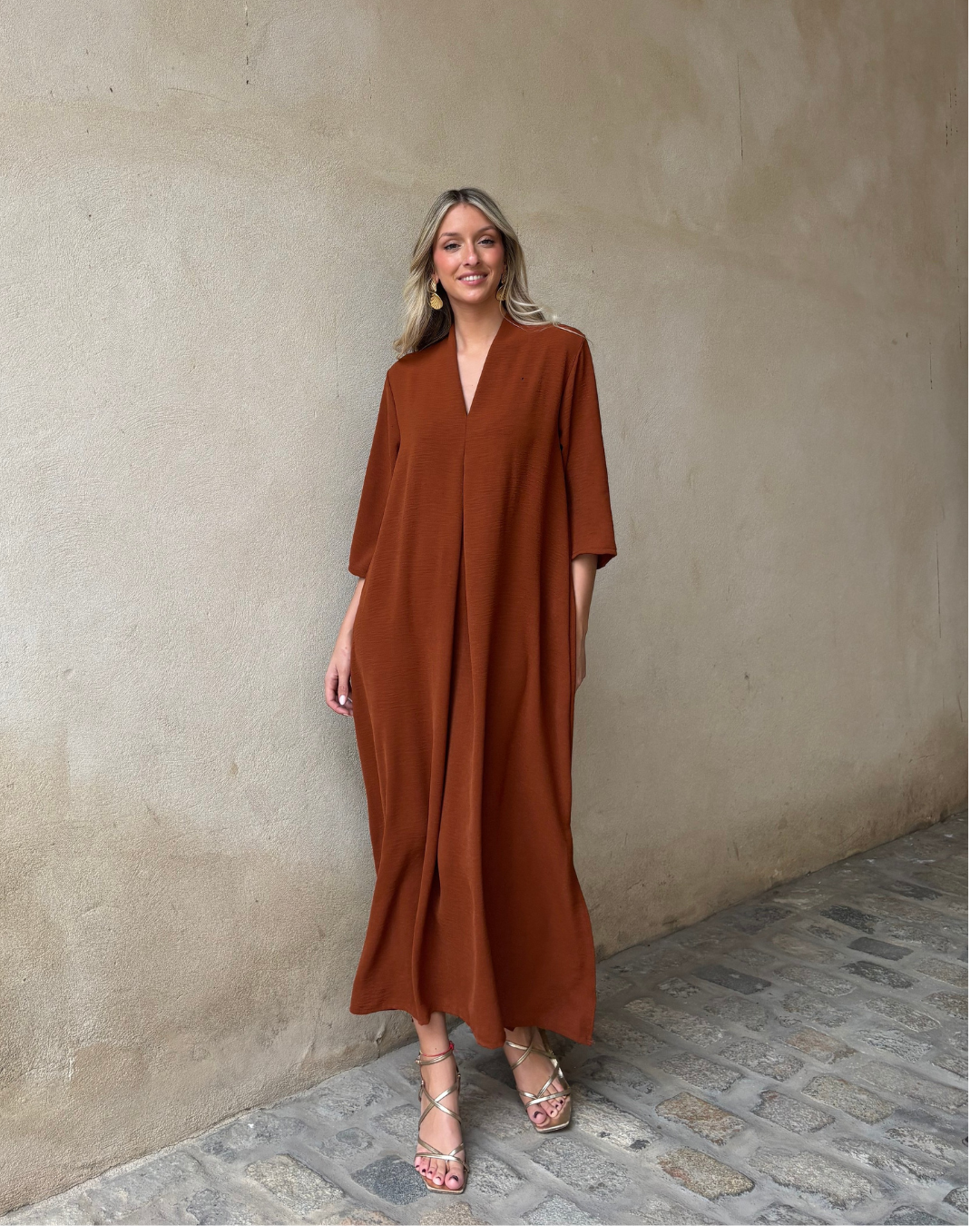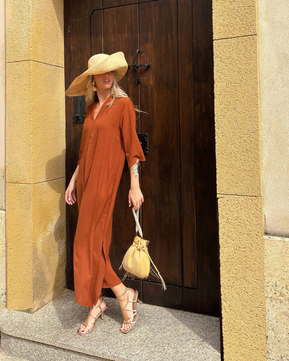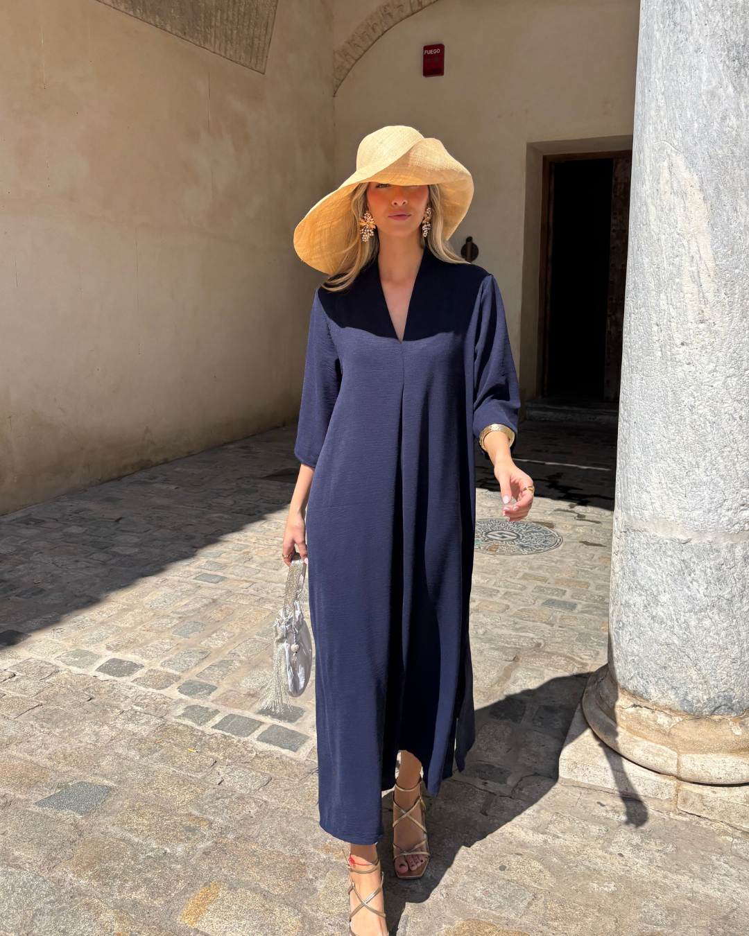La tela es ligera, fluida y cae suelta a lo largo de tu cuerpo sin apretar ni quedarse enganchada en ninguna parte. Sin cintura ajustada, sin tela gruesa, nada que se sienta caliente o sofocante. Simplemente un vestido que te pones y en el que puedes moverte libremente de inmediato — ya sea que salgas, estés en una terraza, des un paseo o estés de vacaciones.